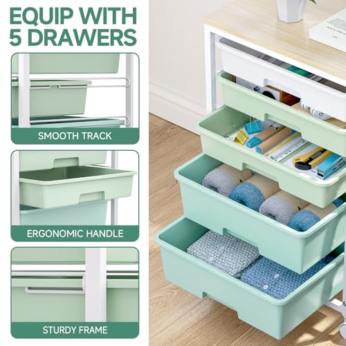 Craft cart,Rolling Cart with Drawers,Storage Cart with 5 Drawers and Wooden Tabletop for Under Desk Organizers and Storage,Green