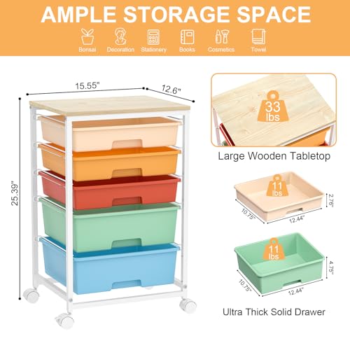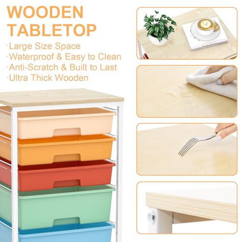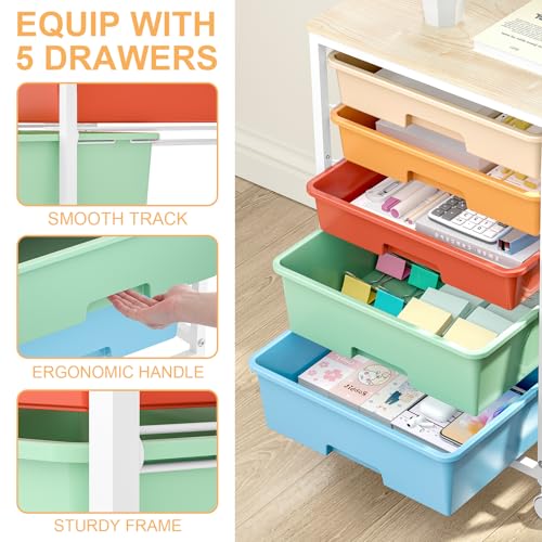Craft cart,Rolling Cart with Drawers,Storage Cart with 5 Drawers and Wooden Tabletop for Under Desk Organizers and Storage,Macaron