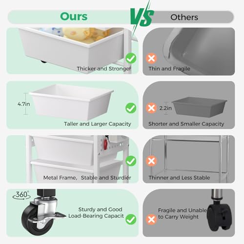 【Easy to Push and Lock】: This storage drawers cart comes with 4 universal wheels for 360° swivel and silent movement; the upgraded and stronger metal wheels allow smooth movement even when you are loaded with items. Meanwhile, press the toggle switch on the wheels to lock the product easily and prevent it from moving.