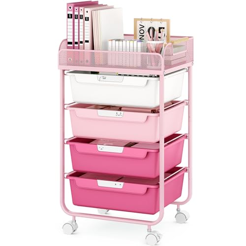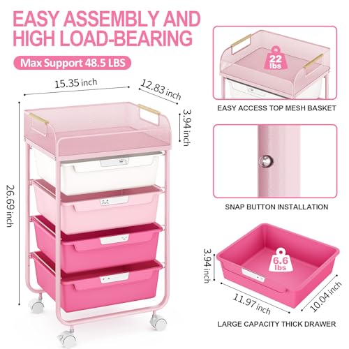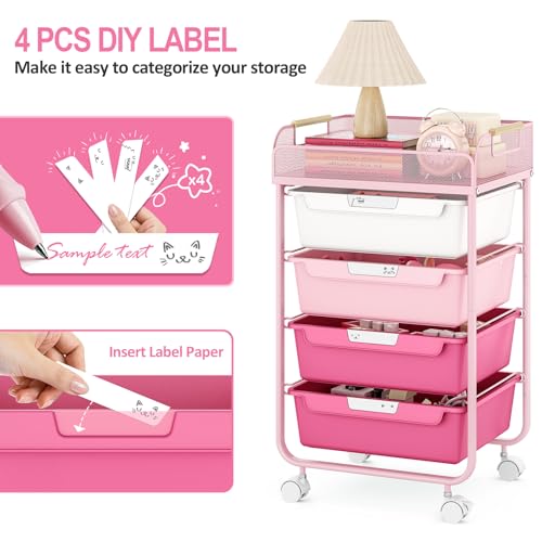 Rolling Cart with 4 Drawers,4 Tiers Rolling Utility Cart Craft Cart,Rolling Storage Drawer Cart with Mesh Top,Storage Cart with Drawers & 4 PCS DIY Lable, Rose Pink