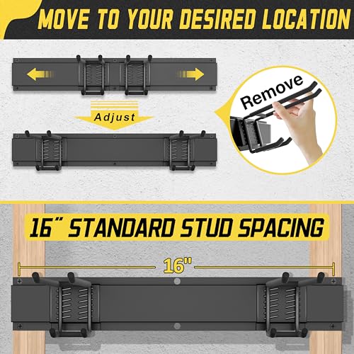 IMPROVED DESIGN:Yard Tool Organizer for Garage.Double Upper Hooks:Wider Spacing to 2.48 inches.Double Lower Hooks:Wider Spacing to 2.52inches.Fulfills More Hanging Needs.Equipped With 9 Hooks(3 Double-Layer Hooks,3 Single Level,3 Small Hook,3 Nylon Taping) and 3 Rails.