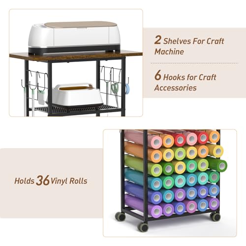 PERFECT STORAGE SOLUTION FOR CRAFTER: iKKLE rolling craft car is large enough to store all your craft supplies, it has 2 versatile storage shelves for craft machine makers, 36 compartments for vinyl rolls, and can neatly store all your rolls of vinyl.