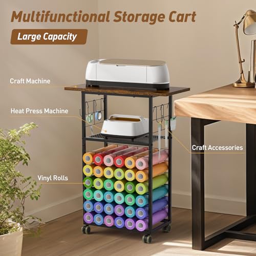 ikkle Rolling Craft Storage Cart with 36 Vinyl Roll Holders, Craft Organizers and Storage Compatible with Cricut Machines, Crafting Table Organization Workstation with Wheels for Craft Room