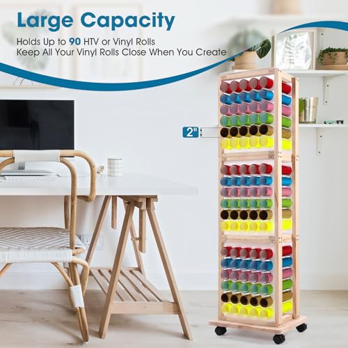 Mobile Vinyl Roll Holder – 90 Compartments Vinyl Storage Cart with Locking Castor Wheels, Wooden 3 Tier HTV Organizer Rack for Craft Room Home DIY (2″ Hole Size)