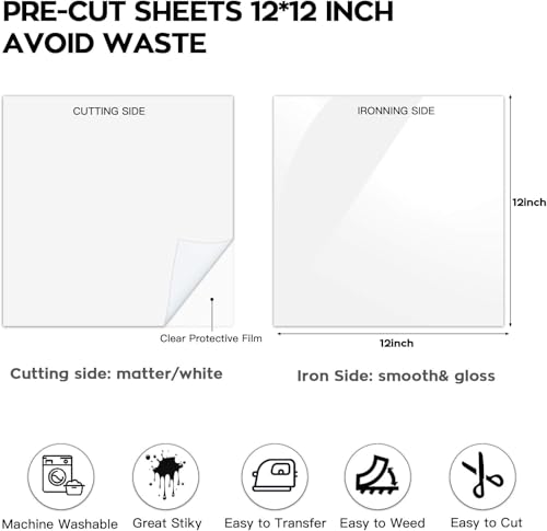 【PERFECT HTV SIZE】Unlike other White heat transfer vinyl 12 x10″.The iron on vinyl measure 12″ × 12″ pre-cut size are perfect for most popular cutting mats and easy and convenient to cut into different size of art designs or logos or letters. large size not only allows you to feel free to design but also can avoid more waste, you can cut to fit your design.